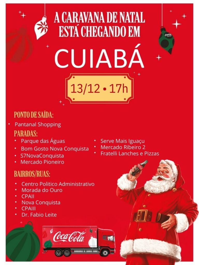 A chegada da Caravana de Natal da Coca-Cola reforça o brilho da programação, já que em Cuiabá, o trajeto parte do Pantanal Shopping no dia 13.12, marcando o início do percurso na capital.