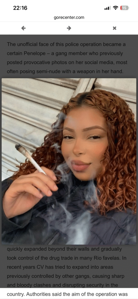 Segundo informações preliminares, Penélope seria integrante do Comando Vermelho (CV) e ganhou notoriedade nas redes sociais por publicar fotos armada e com roupas táticas, tornando-se uma espécie de “musa do crime” para simpatizantes da facção. Ela foi atingida durante o intenso confronto entre policiais e criminosos que ocupavam pontos estratégicos das comunidades.